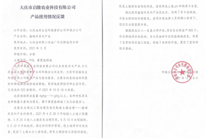 與多所高校、研究院、各大種業(yè)企業(yè)合作種植改良鹽堿地水稻。在黑龍江、吉林、內(nèi)蒙古等地有多處示范基地。在新疆等地區(qū)種植草木,環(huán)境綠化等工程。幾年來,啟隆人大力弘揚“創(chuàng)新、堅韌、拼搏、開拓”的企業(yè)精神,在研發(fā)上勇攀高峰。大慶啟隆 的企業(yè)宗旨是“誠信于鹽堿地的朋友,服務(wù)于鹽堿地的朋友”,努力為鹽堿地改良做出積極的貢獻。